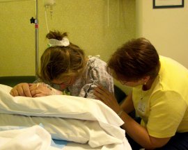 Marie could start pushing. Joan and I helped massage Marie's legs,